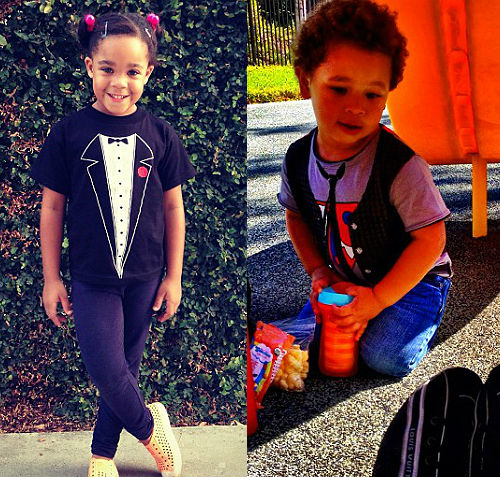 T-shirts don’t get much cooler than this! Zoey Babbs, daughter of singer Tank, rocks a Tuxedo t-shirt for school and Xzibit’s son, Gatlyn, rocks a vest and tie version of the look.