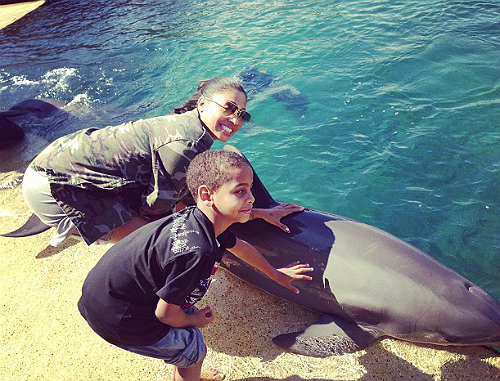 La La Anthony and Kiyan enjoy time together in the Bahamas, petting dolphins and kissing seals. “Dolphin Cay Bahamas. Life is good right now,” tweets the reality star.