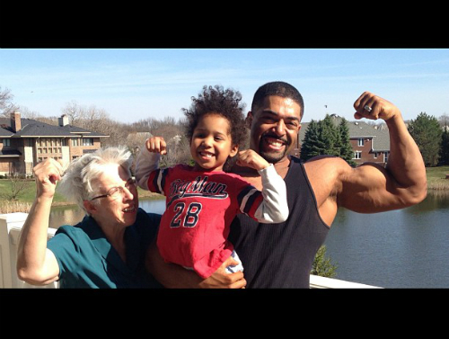 David Otunga Jr.,3, may be big and strong, as demonstrated in this picture with dad and grandma, but there are some things that even strong tots shouldn’t do. Apparently, sliding is one of those things as little David recently broke his leg while going down a slippery slope.