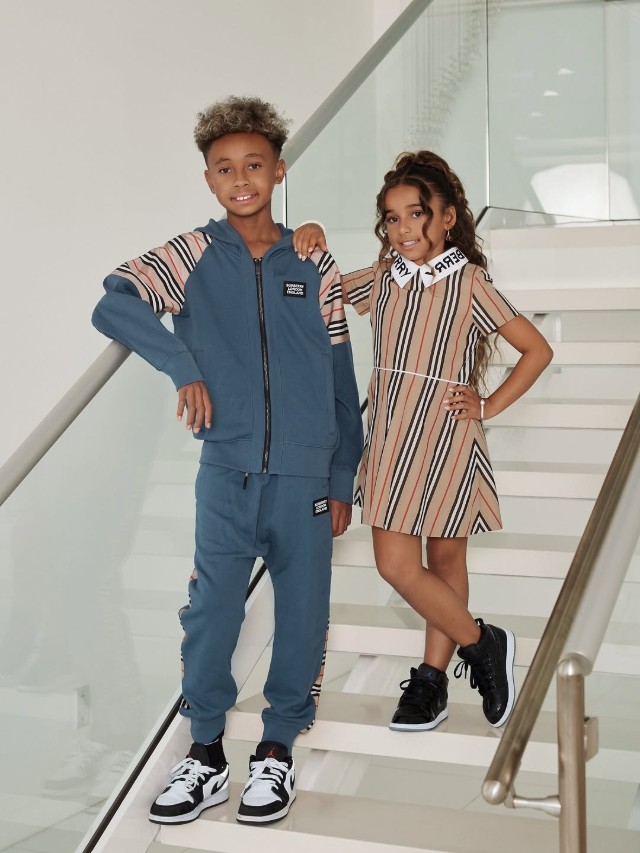 Angela wore Burberry’s Belted Cotton Oxford Shirtdress, while Dream matched in the Alexandra Icon Stripe Dress in Cotton ($560). King completed the family look in the Boys’ Hamilton Icon Stripe Hoodie ($240) with coordinating pants.