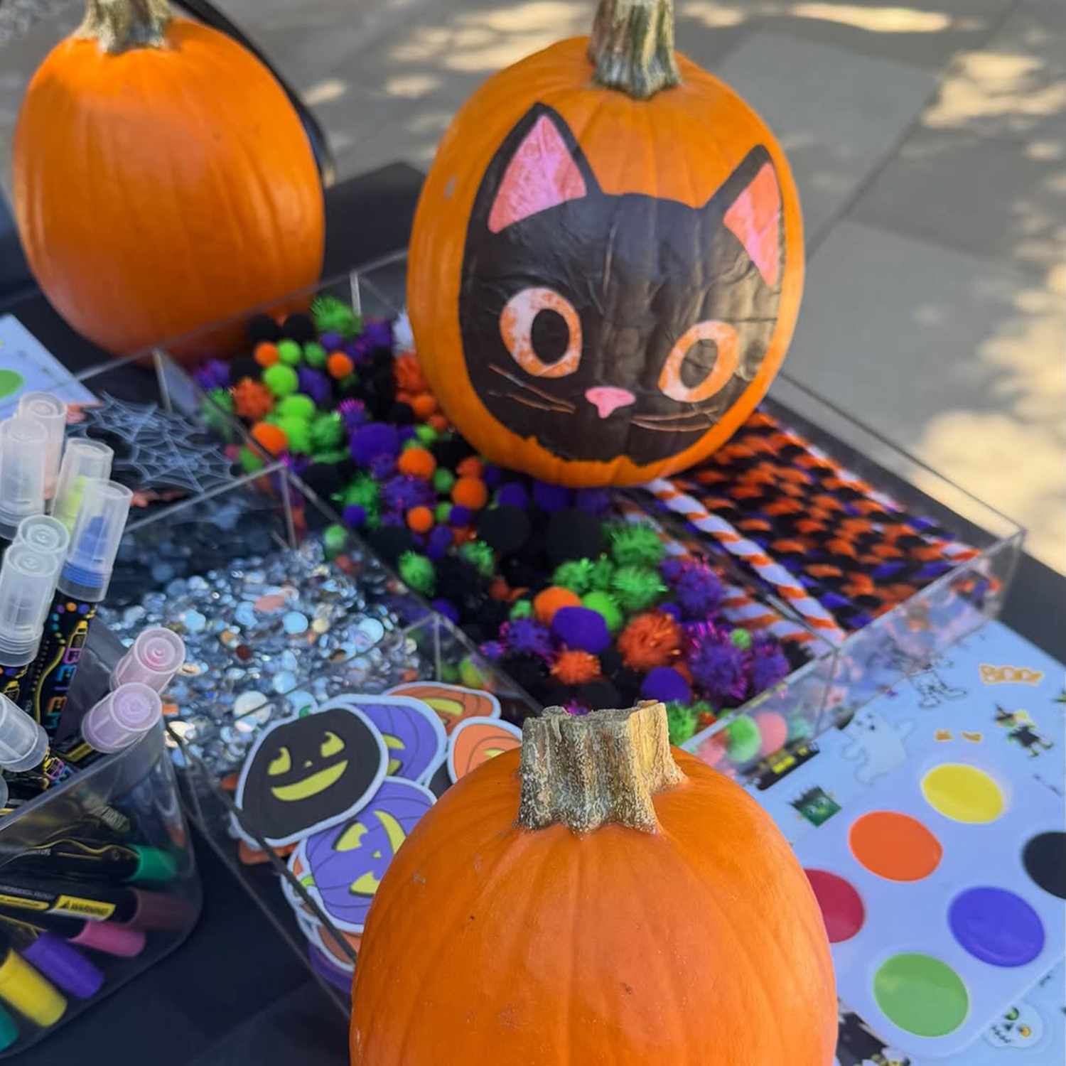 “Look how cute!” Khloe said, highlighting the pumpkin decorating stations, trees covered in witches’ hats and cobwebs, and giant orange-and-black balloon arches that framed the space.