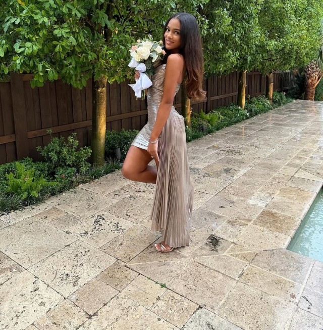 In one photo, the 14-year-old poses outdoors in a metallic champagne mini dress that features a flowing pleated train. She’s holding a bouquet of white roses, her soft glam makeup and sleek, glossy hair tying the whole look together.