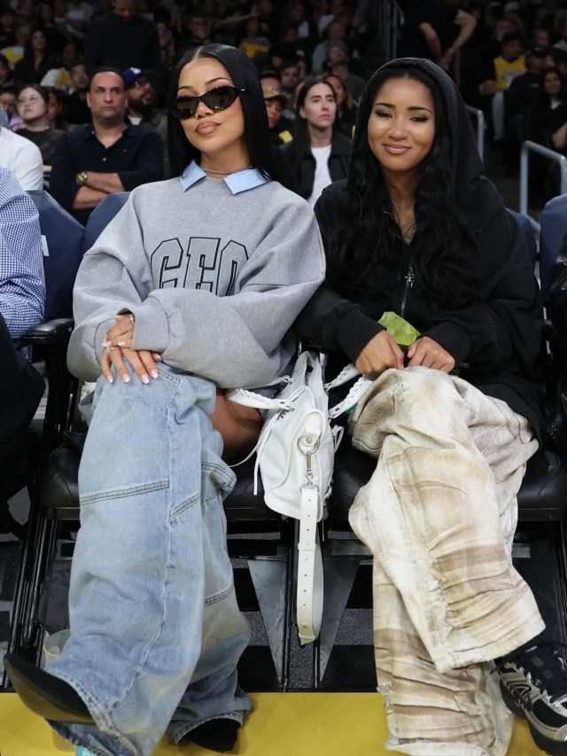 Jhené wore a slouchy gray sweatshirt over a crisp collared shirt, wide-leg jeans, and dark shades. Namiko complemented her mom’s look in a black hoodie and tan pants.