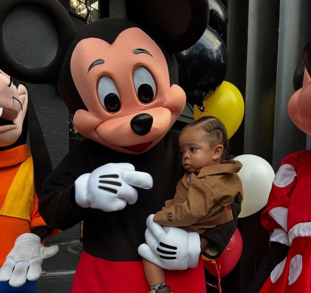 In photos from the celebration, the birthday boy looked picture-perfect in brown pants, a white shirt, and tiny Timberland boots as he partied with Mickey, Goofy, Minnie and the crew.