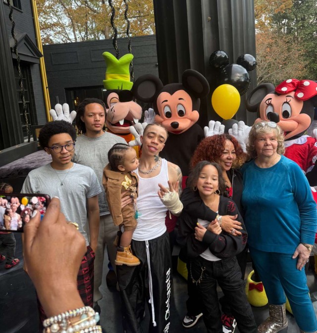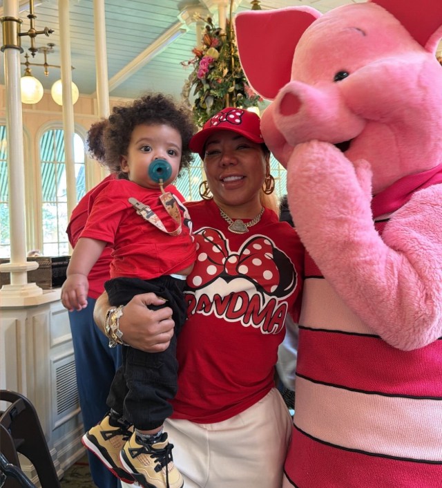 Another photo showed the little one and the rest of the Harris family — including grandma Tiny, grandpa T.I., and several aunts and uncles — posing for a group shot with Mickey, Minnie and Goofy.