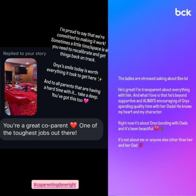 “The ladies are stressed asking about Bee lol,” she wrote. “He’s great! I’m transparent about everything with him. And what I love is that he’s beyond supportive and ALWAYS encouraging of Onyx spending quality time with her Dada! He knows my heart and my character.”