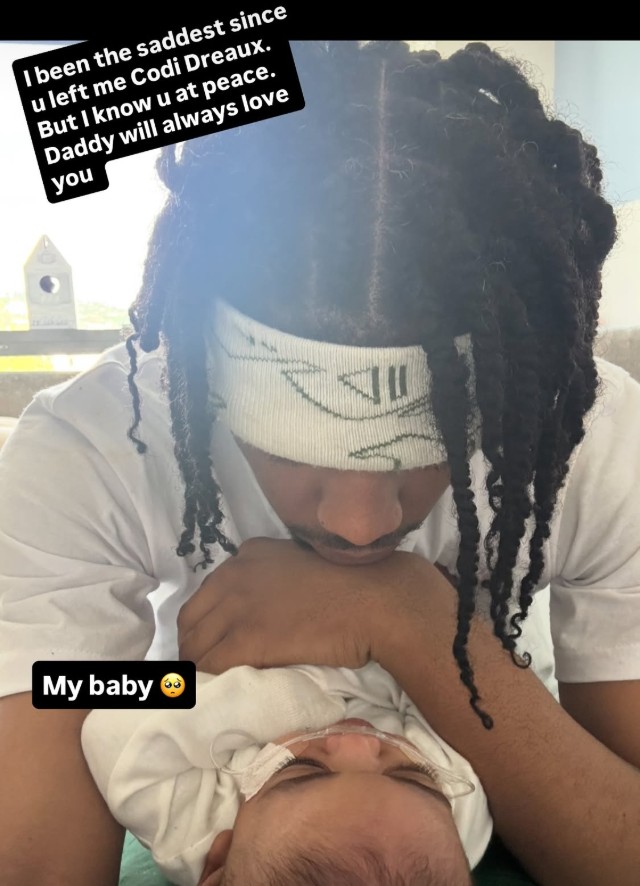 “I been the saddest since u left me Codi Dreaux,” he wrote in an Instagram Story alongside a photo holding his baby. “But I know u at peace. Daddy will always love you.”