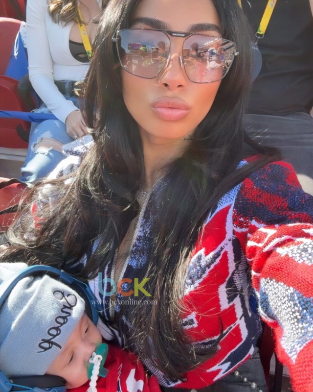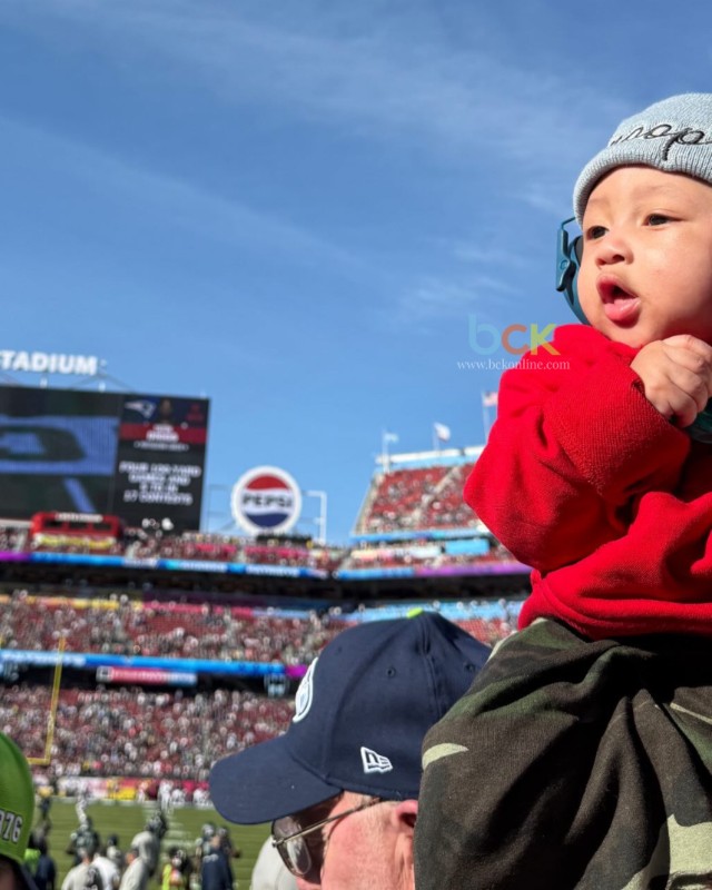Ahead of kickoff, another image showed the baby resting against a cushion at home, dressed and ready. Later, inside Levi’s Stadium in Santa Clara, he sat high above the field in protective headphones as his mom, K’yanna Barber, held him close.