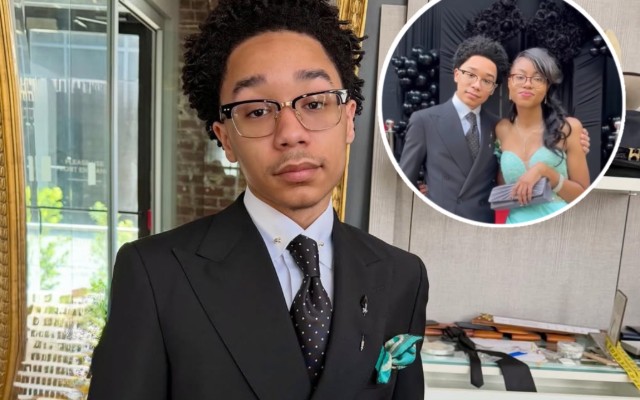 The son of T.I. and Tiny Harris looked dapper for the occasion, wearing a black suit by Hideoki, paired with a polka-dot tie and a turquoise pocket square. His girlfriend matched the look in a turquoise gown.