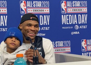 Houston Rockets guard Russell Westbrook was answering questions from reporters during All-Star Media Day in Chicago when his son walked...